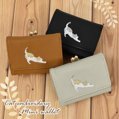 猫 ねこ ネコ 猫グッズ 財布 ミニ財布 レディース がま口 ミニウォレット オシャレ おしゃれ/ フェイクレザー 伸び猫 刺繍 三つ折り /三つ折り財布 ミニ 小さい 小さめ 結婚式 通勤 大人 かわいい 可愛い 無地 シンプル コンパクト 合皮 レザー プレゼント グッズ 雑貨/ p