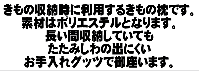 着物お手入れグッツきもの枕(たたみシワ予防・きもの収納枕・販売単位1本2センチ×33センチ)【キモノ仙臺屋の和装小物特集】 商品価格:242円 レビュー件数:39件 レビュー平均:4.77(5点満点) 楽天で購入 トップページへ