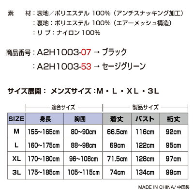 素材 表地/ポリエステル 100%(アンチスナッキング加工) 裏地:ポリエステル 100%(エアーメッシュ構造) リ ブ:ナイロン100% 身長目安 M :155〜165cm L :165〜175cm XL :170〜180cm 3L :175〜185cm 商品番号 A2H1003-07→ ブラック A2H1003-53→ セージグリーン 商品説明 オリジナルの「AVIREX」のアップリケロゴを取り付けたMA-1 AIR MC JAC のコマーシャルロゴモデル。