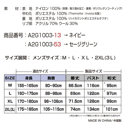 素材 表 地:ナイロン 100%(耐久撥水加工) 中わた:ポリエステル 100%(INVISTA社製サーモライト) 裏 地:ポリエステル 100% リ ブ:アクリル70% ウール30% 身長目安 M :155〜165cm L :165〜175cm XL :170〜180cm 3L :175〜185cm 商品番号 A2G1003-13→ ネイビー A2G1003-53→ セージグリーン 商品説明 映画「トップガン」で主人公が着用していたG-1ジャケットのワッペン ディティールをMS.PGオリジナルにアレンジし、MA-1に落とし込んだブルゾン。
