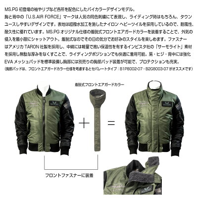 MS.PGオリジナル仕様の着脱式フロントエアガードカラーを装着することで、 外気の侵入を最小限にシャットアウト。