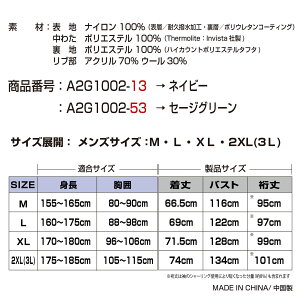 素材 表 地:ナイロン 100%(耐久撥水加工) 中わた:ポリエステル 100%(INVISTA社製サーモライト) 裏 地:ポリエステル 100% リ ブ:アクリル70% ウール30% 身長目安 M :155〜165cm L :165〜175cm XL :170〜180cm 3L :175〜185cm 商品番号 A2G1002-13→ ネイビー A2G1002-53→ セージグリーン 商品説明 MS.PG初登場の袖やリブなど各所を配色にしたバイカラーデザインモデル。