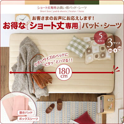 ショート丈専用 お買い得パッド・シーツ Short Size [pad & sheets] 5 Color / 3 Sizeお客様のお声にお応えします!\お得な「ショート丈専用」パッド・シーツ/180cm 小さいサイズのベッドに“ピタッ”とハマる!!5カラー/3サイズ(SS/S/SD)敷きパッド/ボックスシーツ---------------------------------------・Short size_ショート丈ベッドに「ピタッ」とかかる待望のショート丈サイズ・Care Easy_速乾性&シワになりづらくお手入れ楽! ピーチスキン仕様でなめらかな肌ざわり・2type_暮らしに合わせて選べる2タイプ・5Color_インテリアに合わせて選べる5カラー・3Size_ベッド幅に合わせて選べる3サイズ---------------------------------------Short Size Cotton toweling [pad & sheets]180cm Short Size---180cm Short Size---「部屋は狭いからショート丈ベッドを買ったけれど、合うシーツがない」、「子供用に脚付きマットレスベッドを買ったけれど、シングルサイズだとぶかぶかでかっこ悪い」などのお声をたくさんいただきました。